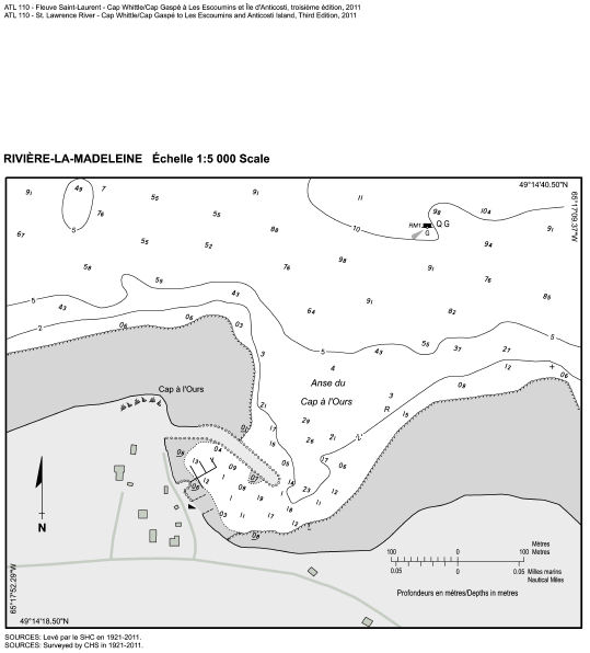 Rouge de 289° à 182°54'; blanc de 182°54'; à 186°25'; vert de 186°25' à 072°. Le secteur blanc indique la route à suivre. Fonctionne de nuit seulement. Saisonnier. Carte:4405 Éd. 01/13(G12-107) |